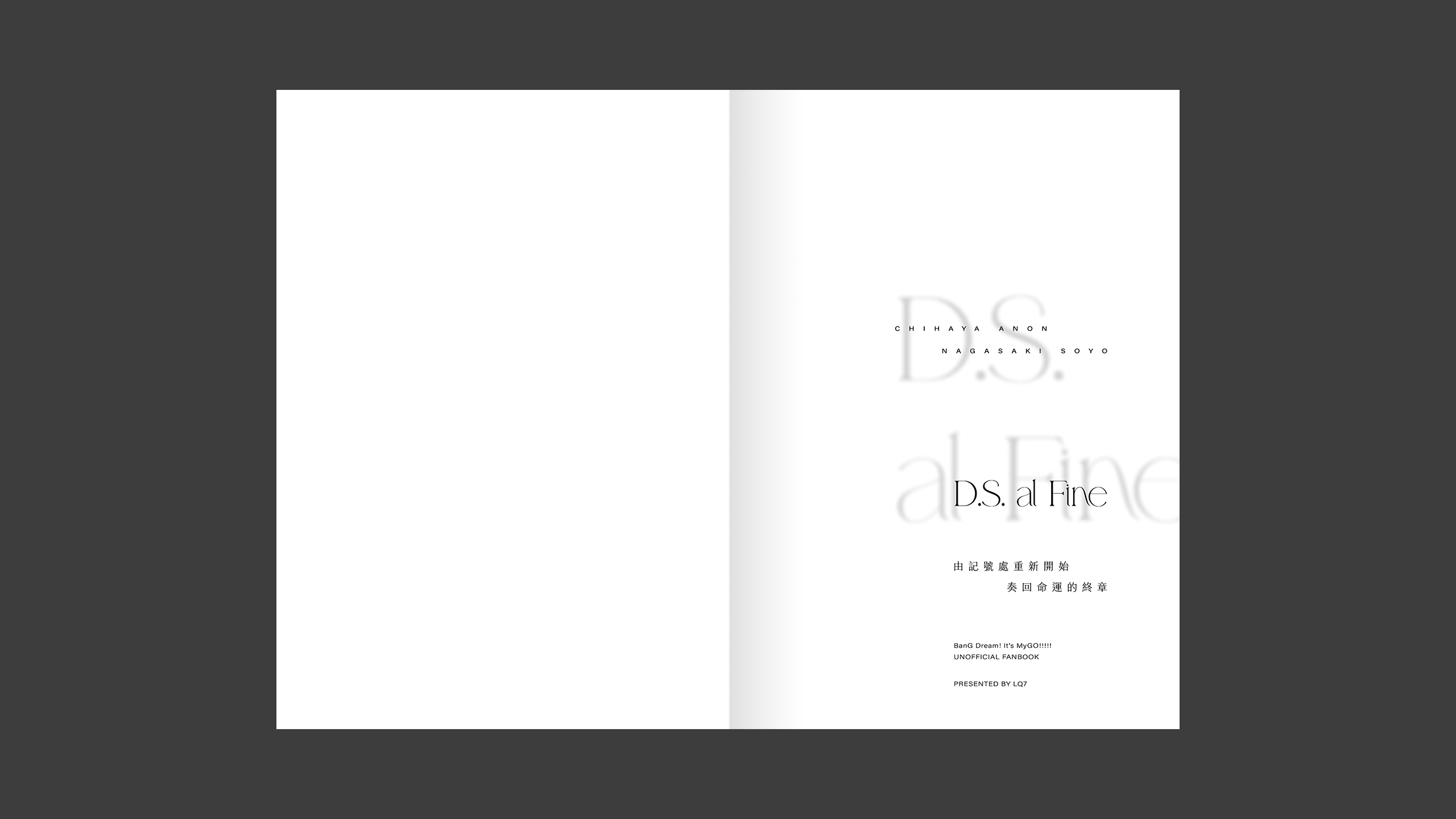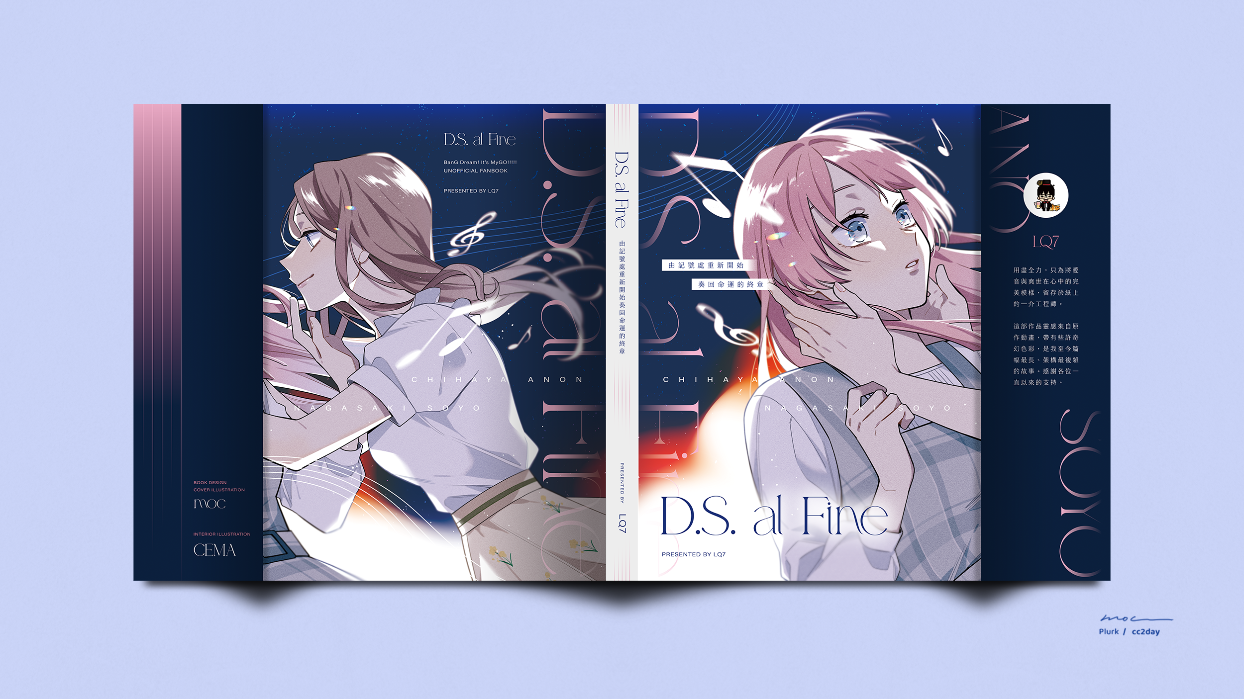 《D.S. al Fine》是我第三本關於愛音與爽世的一般向同人小說,也是迄今篇幅最長、架構最複雜的故事——共 238 頁、七萬餘字,全書由 moc 老師設計,裡面還有 CEMA 老師的 14 頁精美插畫。