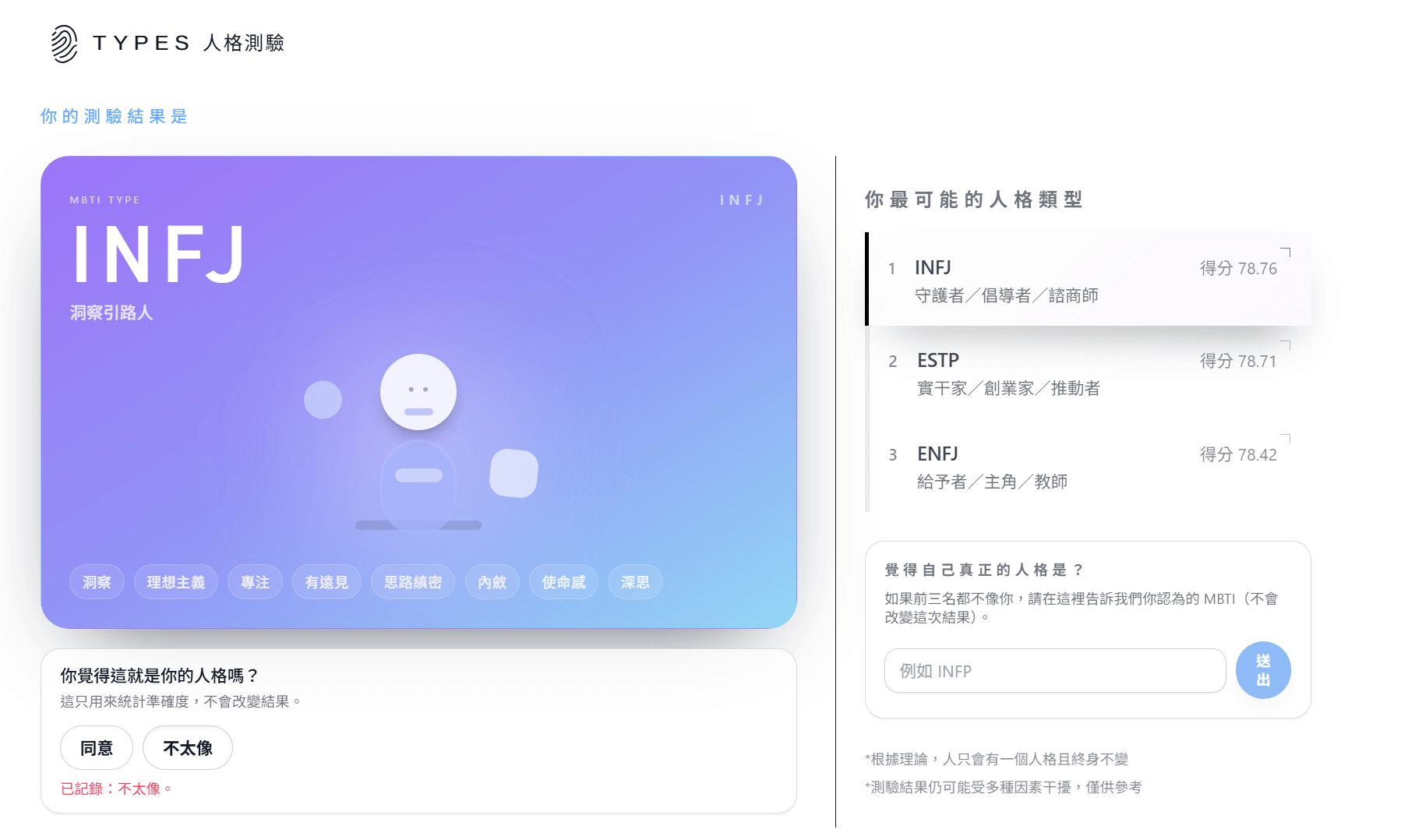 於是照著提供的連結再測了一次,得到的答案前三名是 INFJ、ESTP、ENFJ。