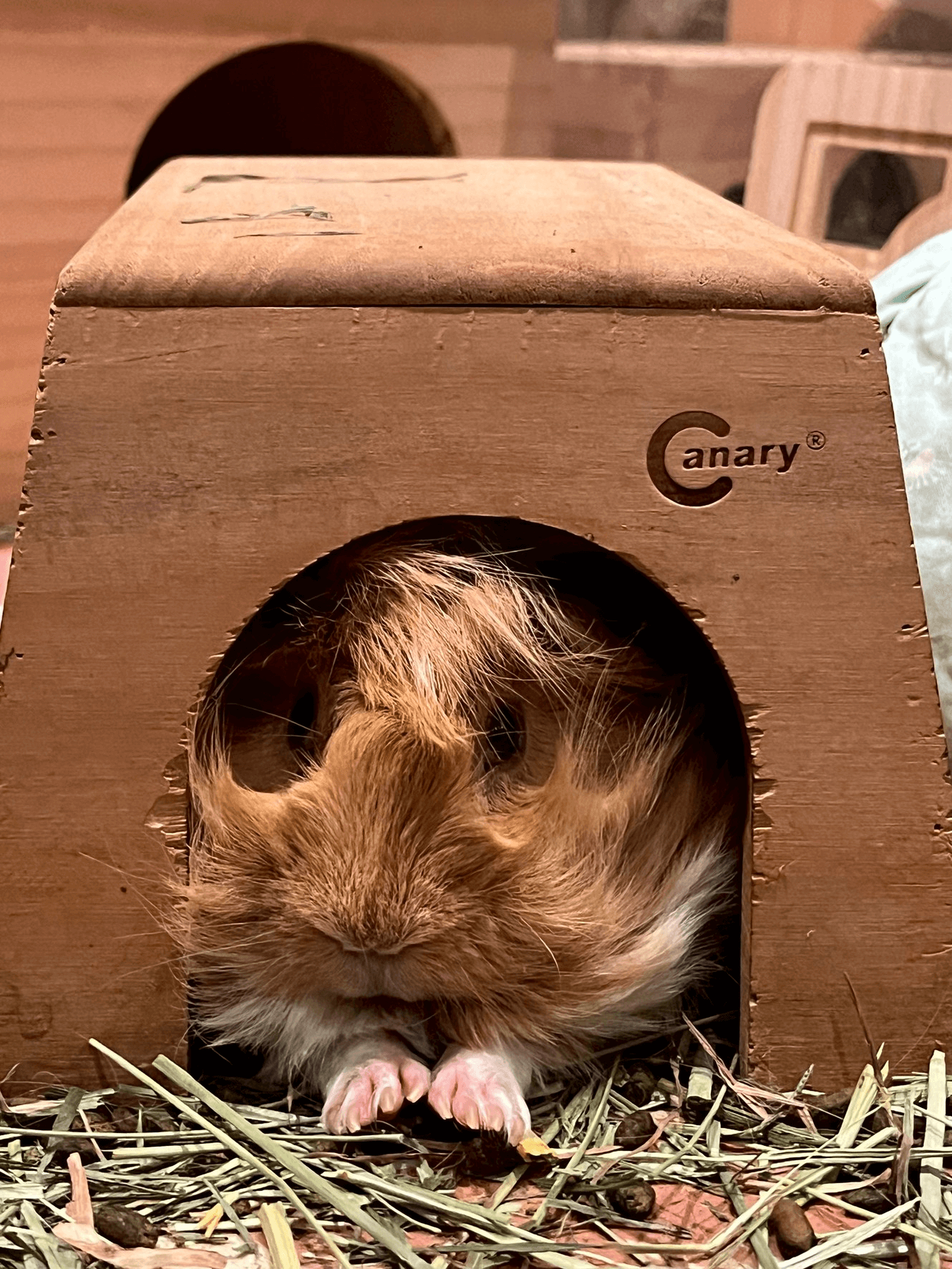 (我家天竺鼠「鳳梨」最愛躲在有安全感的跳箱裡面了,雖然牠可能不知道牠因為太大隻並沒有完全躲住,屁股常多露了一截出來)